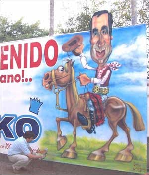 Generalmente publico caricaturas en blanco y negro para diarios. Entonces me documento con la mayor cantidad posible de fotos del personaje; trato de descubrir ese rasgo que lo diferencia, una pose, un gesto (si lo descubro mejor). Planto un esquema muy simple con lápiz HB, trabajando la construcción de la cabeza desde la exageración del corte de cara o continente, tirando los ejes de ubicación de los rasgos. Cuando veo que funciona el esquema, tomo un lápiz 8B y defino casi todo el trabajo. Dejo algunos toques para un lápiz dermatográfico (es el que usan los cirujanos para marcar la piel de sus pacientes) para darle mas carácter al dibujo. Realizo esto sobre papel o cartulina alisada (las texturas en el soporte me van para trabajos mas grandes), luego lo escaneo y, si es necesario, lo termino en Photoshop.