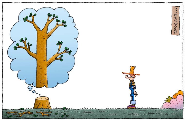 El Jardinero Mágico piensa en los árboles talados,