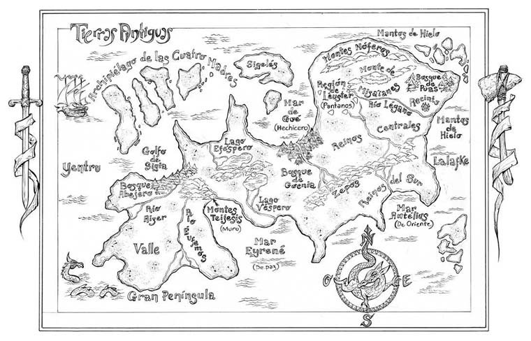 El mapa de las Tierras Fértiles es obra de O’Kif y se publicó en el libro Los días del Venado (Buenos Aires, Grupo Editorial Norma, 2002). El de Tierras Antiguas fue realizado por Pez para ser incluido en Los días del fuego (Buenos Aires, Grupo Editorial Norma, 2004).