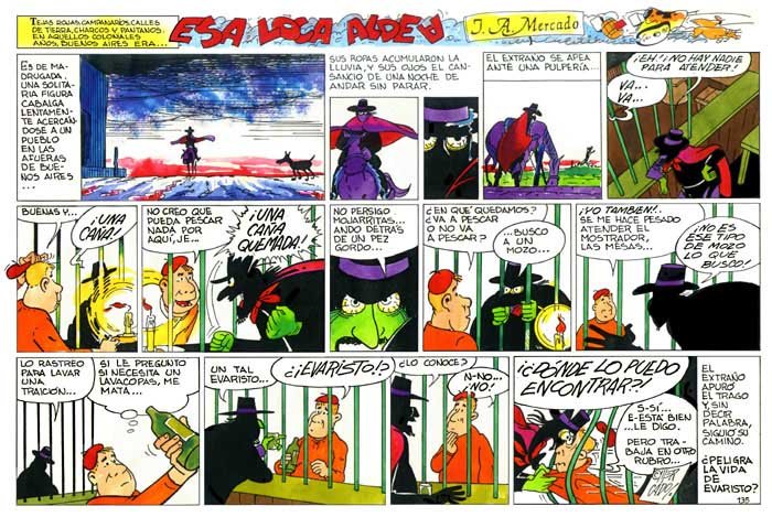"El nacimiento de ‘Esa loca Aldea’ fue de forma inesperada. Como me gusta hacer historietas —y siempre soñé con publicar con continuidad historietas de mi autoría— suelo tener proyectos en danza, en distinto grado de elaboración. Un día me llamaron del diario La Nación para una entrevista porque, dijeron, querían encargarme una historieta. Muy entusiasmado junté en una carpeta mis últimas creaciones, las que más ganas tenía de publicar, y partí rumbo al diario. Lo que llevé ni lo miraron. Me pidieron que creara una historieta con un contexto histórico. La época que yo eligiera, la temática que quisiera, dirigida al público infantil y juvenil. El plazo, como siempre: para ayer. Salí de allí con una mezcla de decepción y entusiasmo. En el viaje a casa, en el subte, ya había decidido el tiempo histórico: la época colonial. Una vez en casa, consulté la escasa bibliografía que tenía (especialmente La Gran Semana de Mayo, el libro de Vicente Fidel López) y boceté 2 páginas a lápiz."
