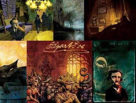 Ofrecemos el preview de Poly Bernatene para las obras de Edgar Allan Poe, donde aparece un retrato del escritor junto a varias de las imágenes incluidas en los libros. (Click en la imagen para verla más grande.)
