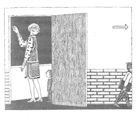 "Cuando entró en clase, su profesora dijo: «La clase de párvulos es al fondo del pasillo, bonito.»